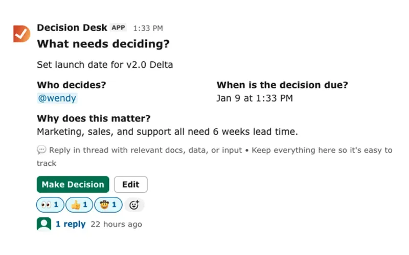 We’ve seen teams reduce stalled discussions by half just by using Decision Desk to track ownership.